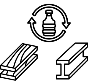 Nous offrons à nos clients la possibilité de réaliser leurs projets en combinant différents matériaux, car nous travaillons des bois certifiés (PEFC, FSC), du métal et des plastiques recyclés (PMMA Greencast ou PS recyclé, broyés dans nos propres installations).